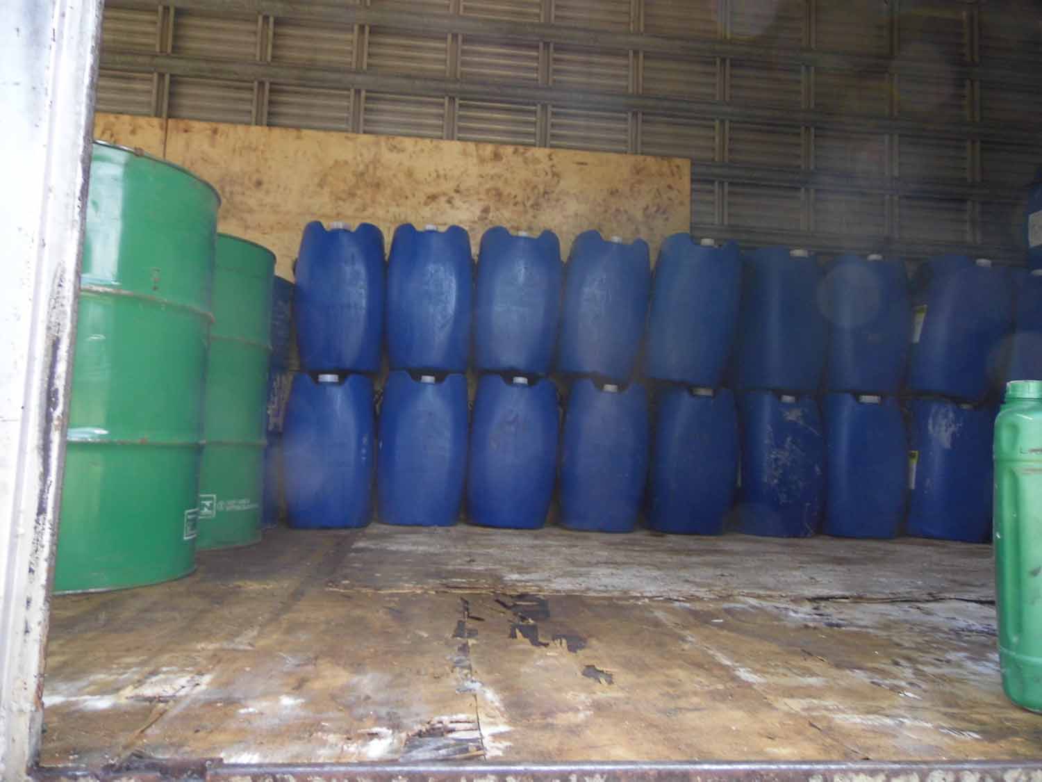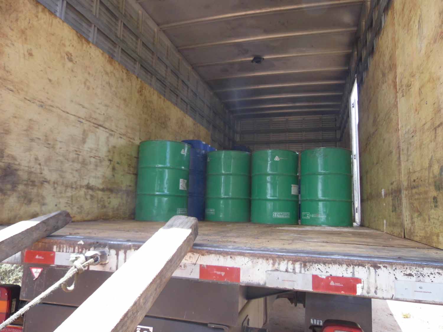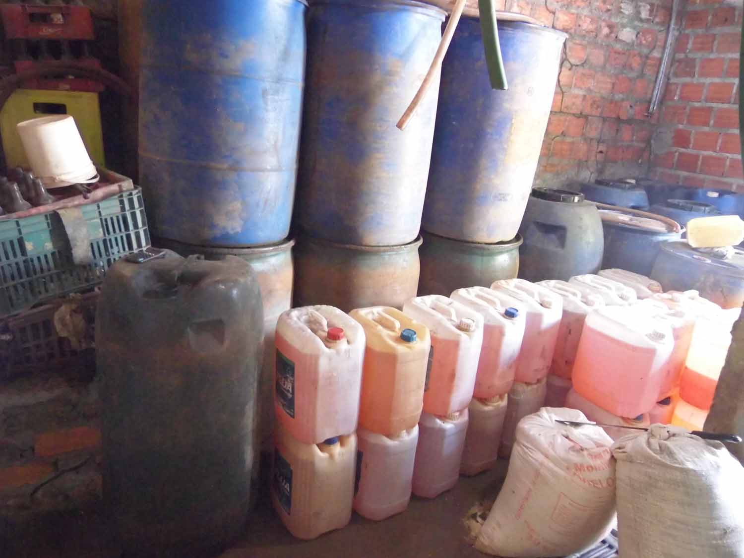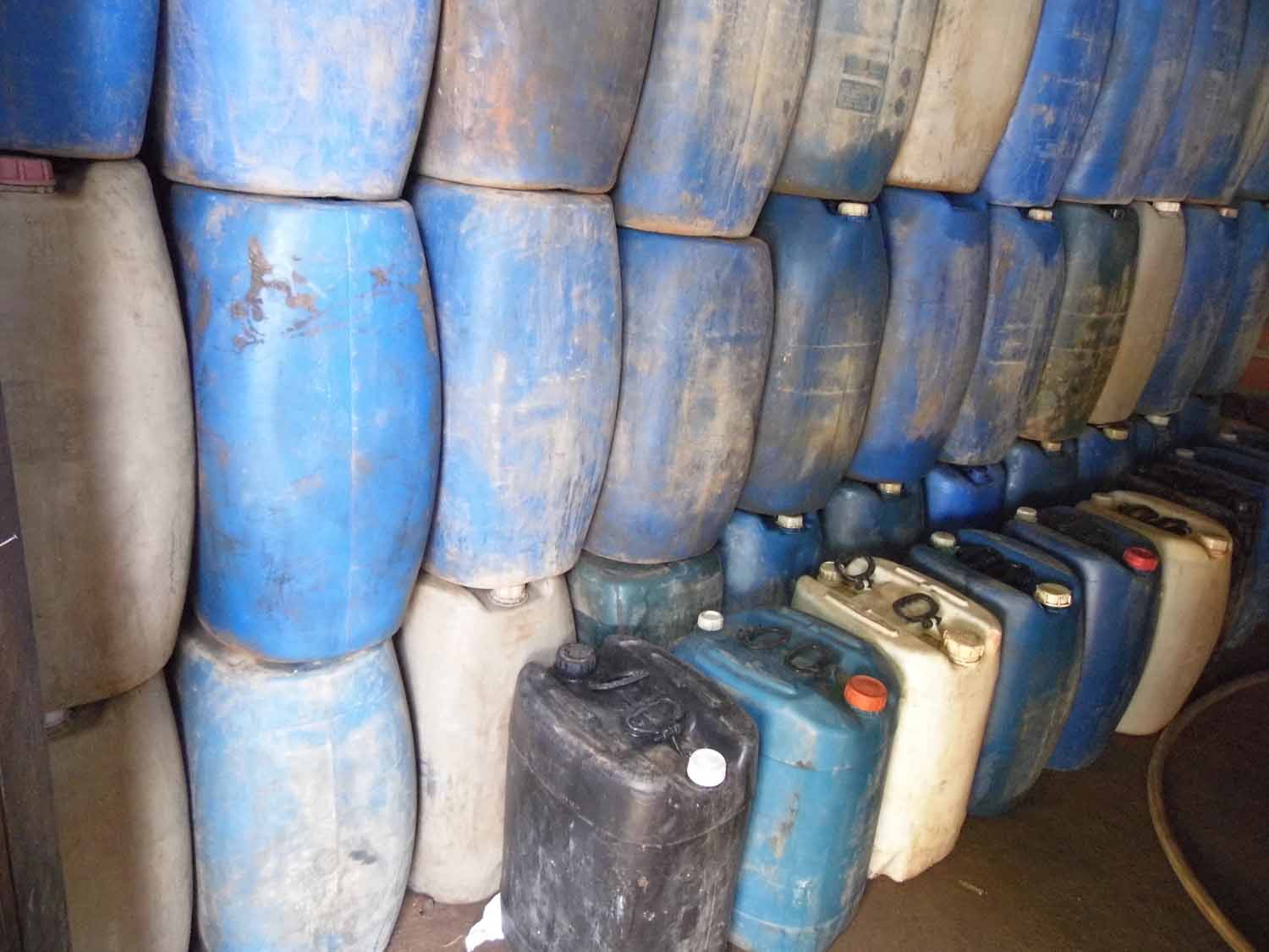 Os policiais encontraram mais de 2.000 litros de gasolina e vários tambores de um produto de parafina para adulteração.