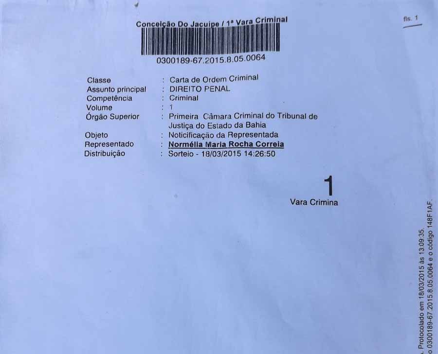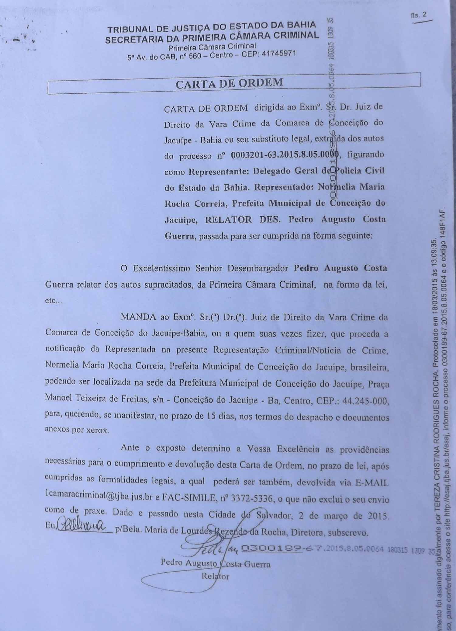 A representação foi encaminhada ao Presidente do Tribunal de Justiça do Estado da Bahia (Desembargador Eserval Rocha) em 23 de fevereiro de 2015 , e julgado procedente, em 2 de março de 2015, onde foi expedida uma Carta de Ordem Criminal ao Fórum de Conceição do Jacuípe para que a Prefeita tomasse ciência do processo, na qual foi cumprido o mandato de notificação e recebido pela Prefeita em 27 de março de 2015.