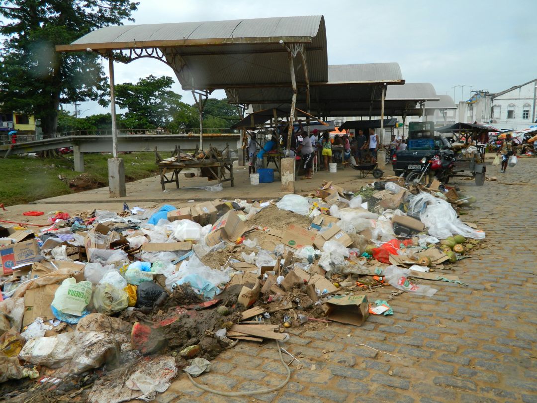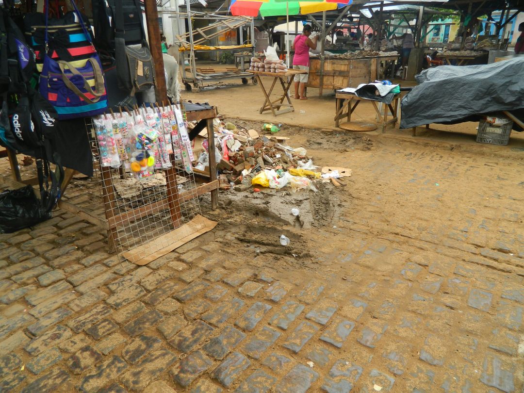Depois da enchente, a feira livre de Santo Amaro esta comercializando seus produtos como frutas, verduras e demais alimentos, bem ao lado do lixo acumulado pelas chuvas do ultimo fim de semana, conforme fotos registradas pelo nosso colaborador, nesta terça-feira, 14/04, o lixo acumulado, mais a lama e dejetos de humanos e animais, estão compartilhando com os feirantes e as pessoas que necessitam comprar seus alimentos.