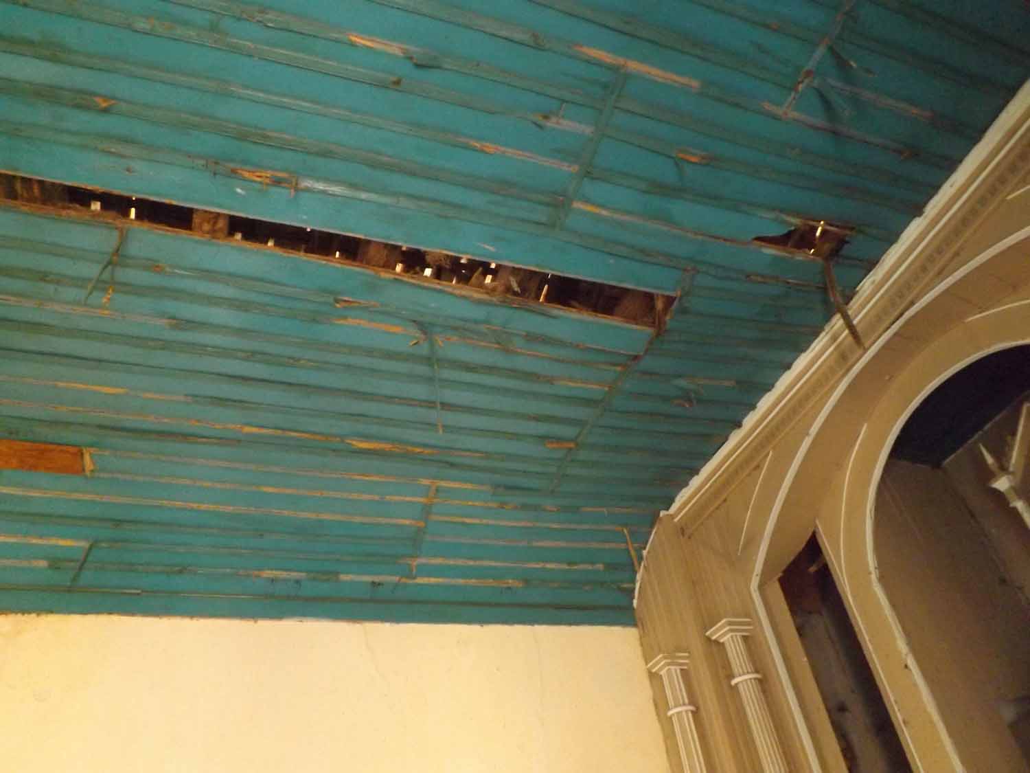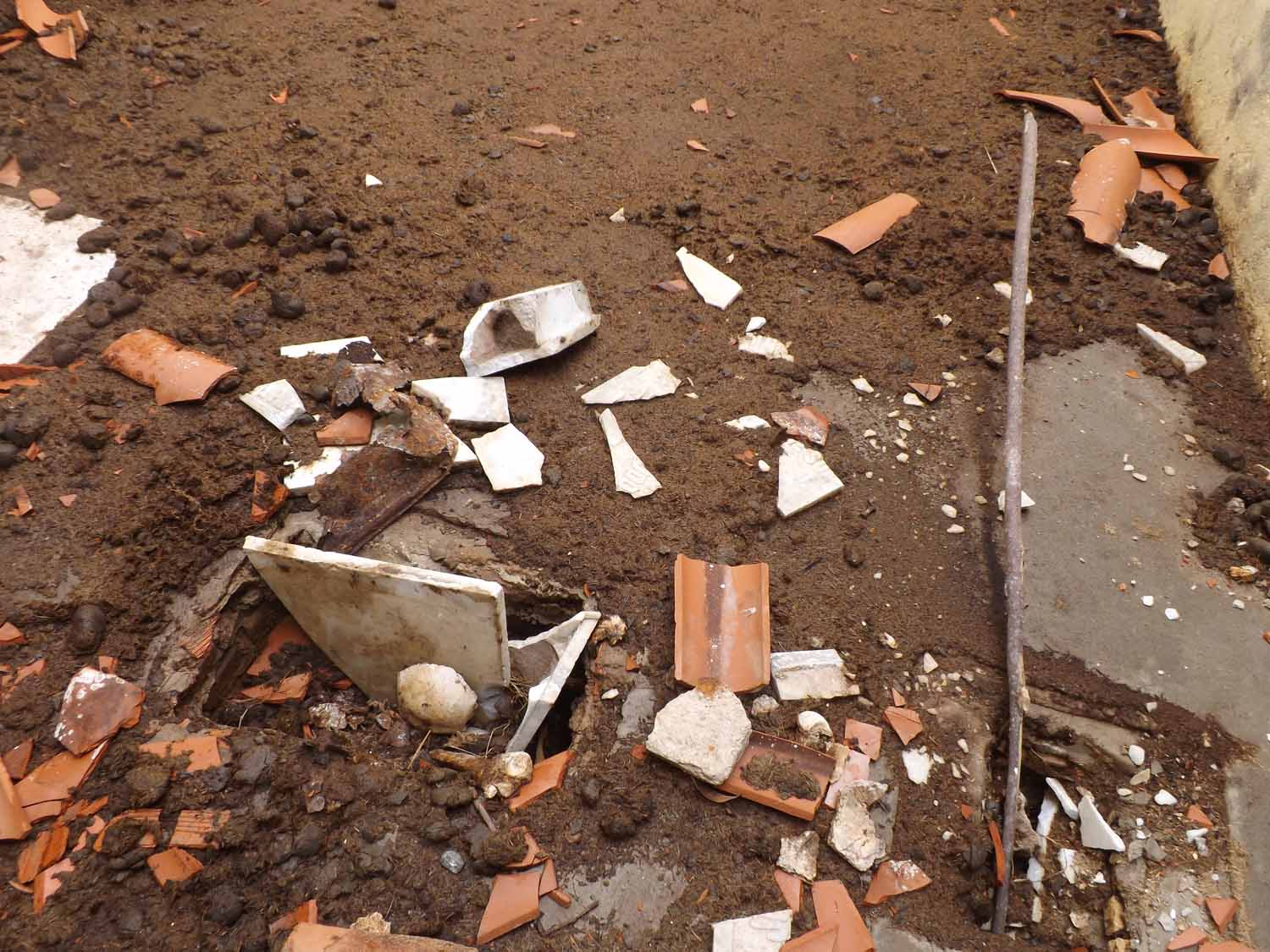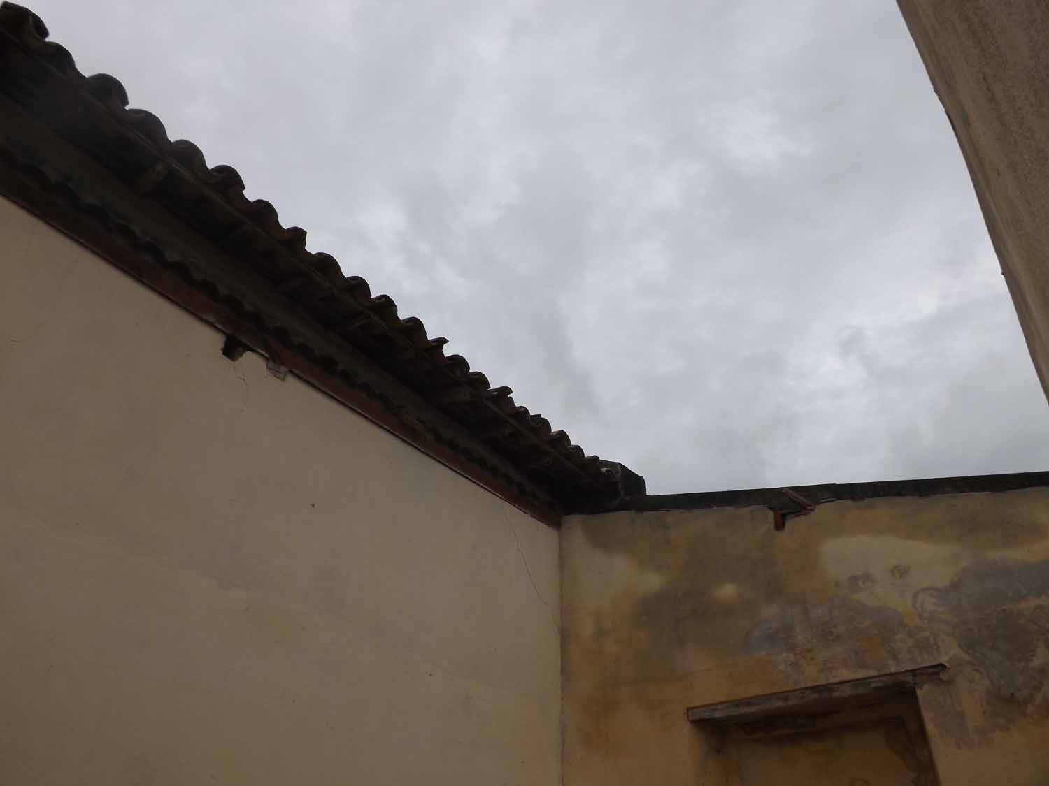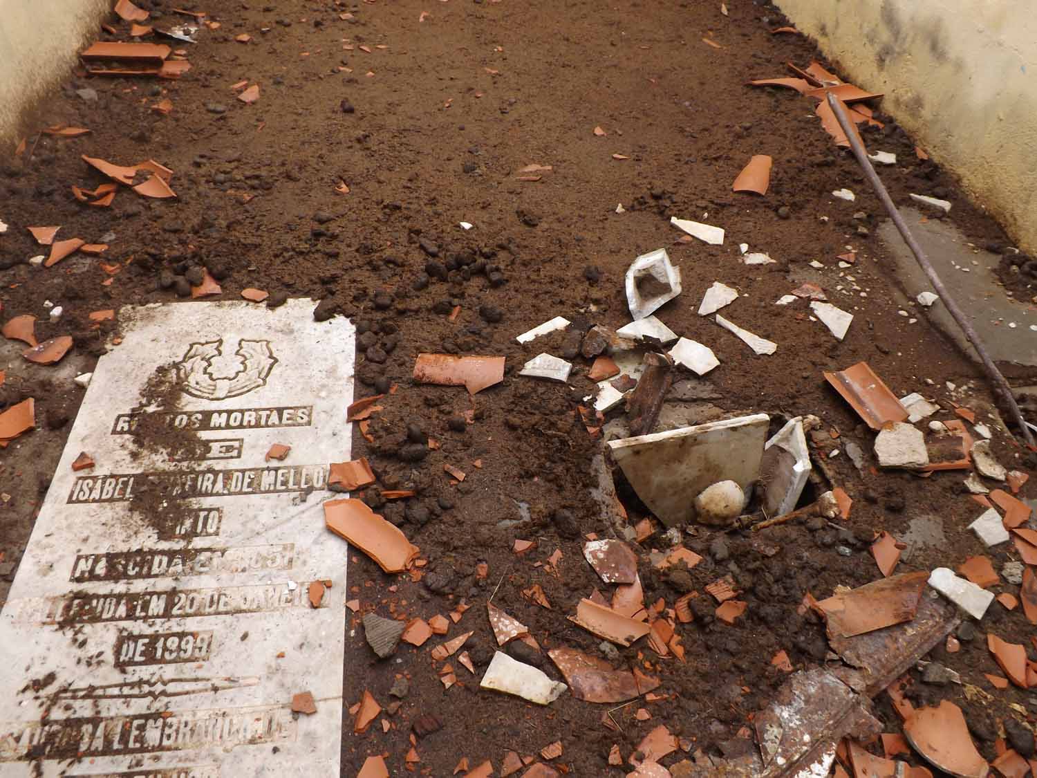 Telhado roubado e mais tumulos violados, com ossos à mostra.